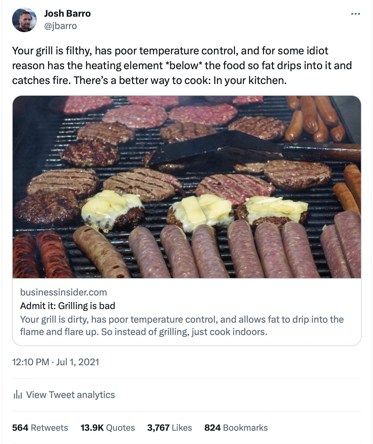 Josh Barro, 2021: “You turn the heat up high, you scrub the grates with a brush so some soot falls into the fire, and you call it clean. If you did that with a frying pan covered in burned-on food, people would call you disgusting and refuse to eat in your house. Well, I have news for you: It's still disgusting. Every time you grill, you're putting your new food right on top of the burned old food from last time, so it crusts onto your new food. Ew.”