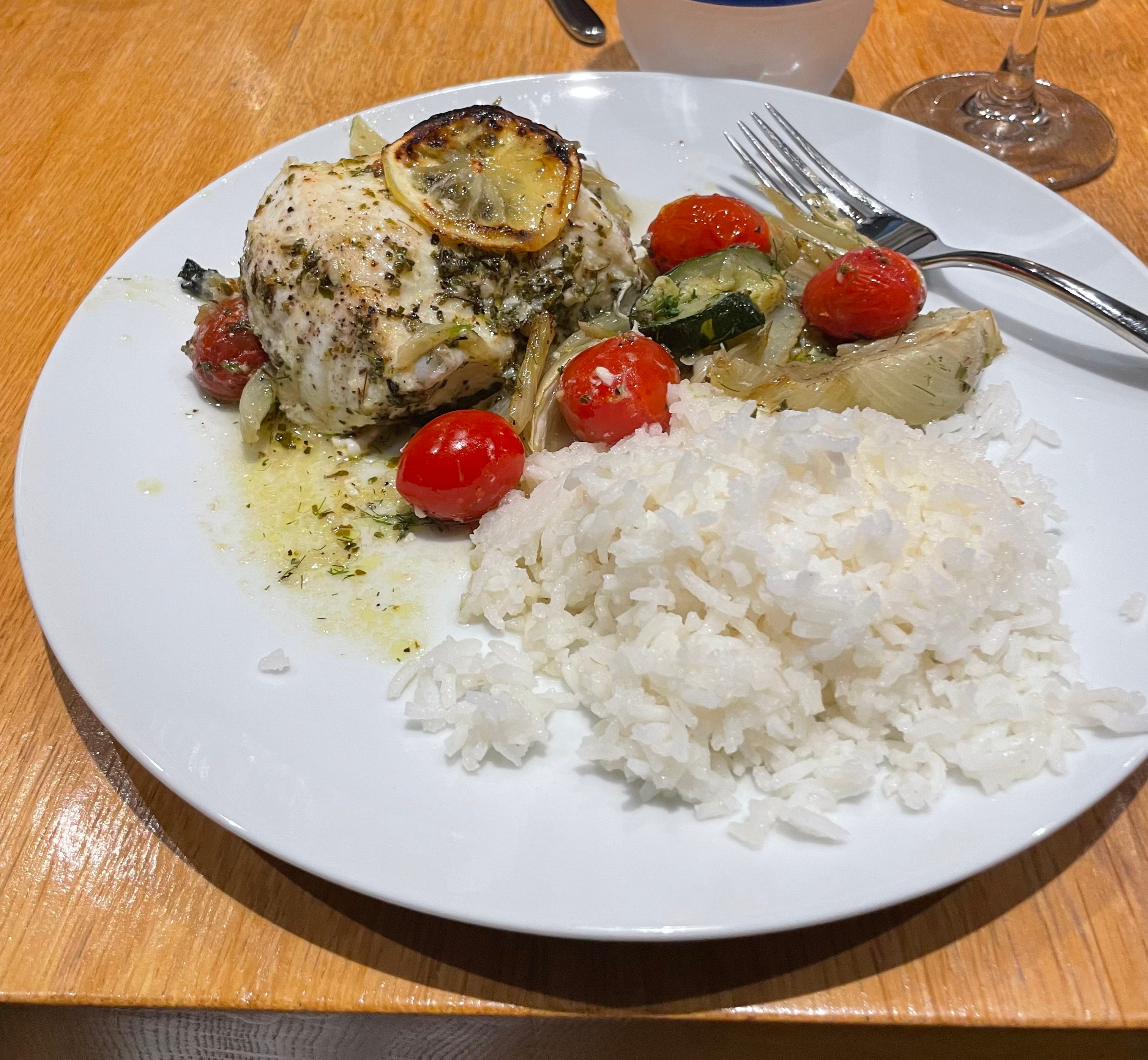 Meanwhile, I take six-ounce halibut fillets and coat them very generously with minced garlic, olive oil, lemon zest, and dried oregano in a large casserole dish. I surround the fish with cherry tomatoes and top the fillets with sliced lemon. Then I broil the fish on high until the halibut reaches 130°. (Watch the lemon and tomatoes for over-browning; switch to baking at 400° with foil over the casserole dish if they’re getting too brown.) When everything is done cooking, add the fennel and zucchini to the casserole with the fish, and serve with white rice: