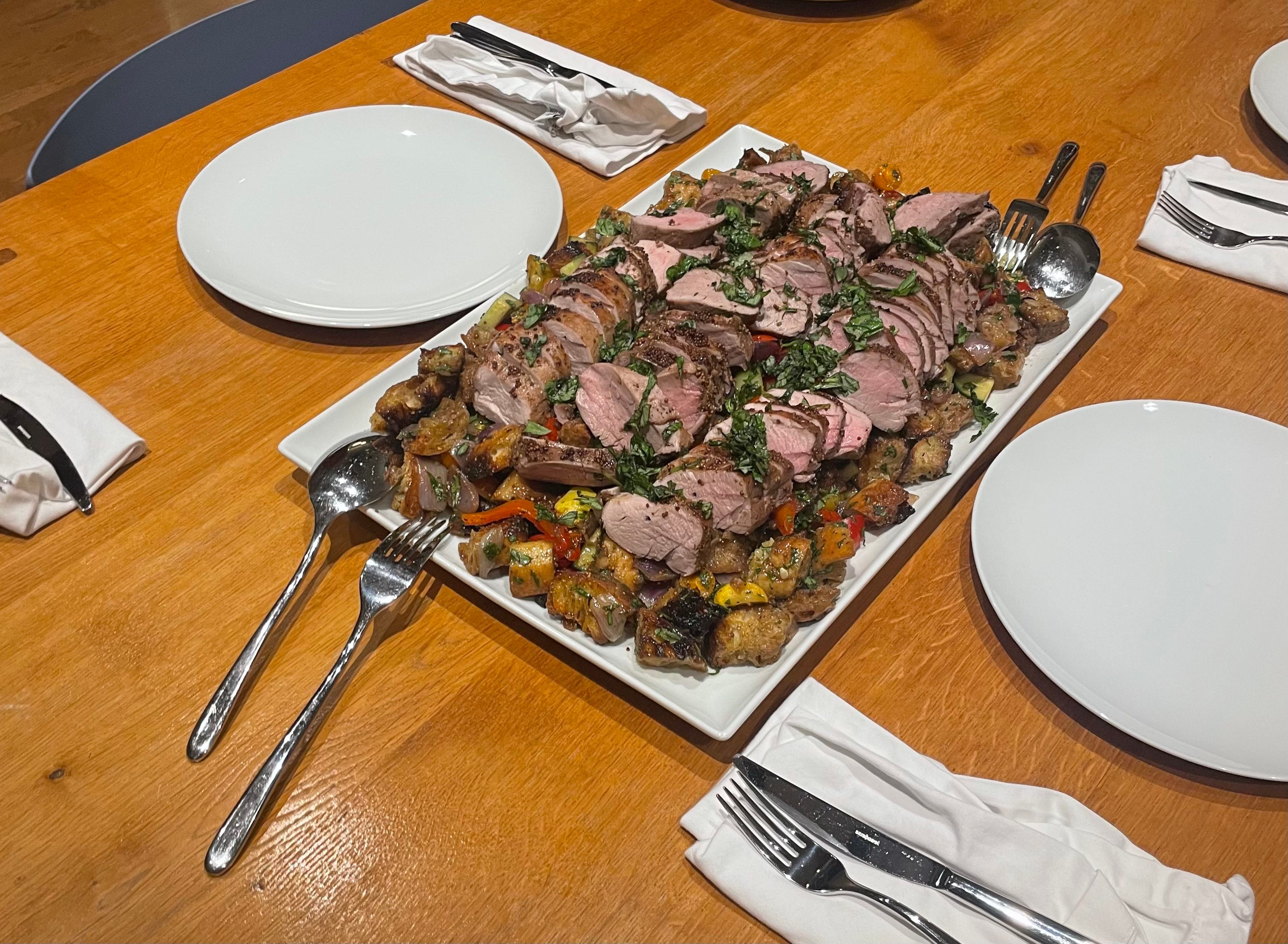One strategy for avoiding both the stove and the grill is a hearty salad with lean roasted meat. My go-to recipe of this type is a pork tenderloin panzanella salad from Cook’s Country. It’s super simple: you glaze pork tenderloins with a mix of brown sugar, balsamic vinegar and whole-grain mustard, and surround them on a baking sheet with oiled, cubed sourdough bread and sliced yellow squash, red bell peppers, red onions, roasting them all on high heat until the meat reaches 140°. (Watch the croutons for over-browning and toss occasionally; if they’re getting too brown, cover the baking sheet with foil.) While the meat rests, you toss the roasted vegetables and croutons with cherry tomatoes, English cucumber, and a tangy garlic, caper and balsamic dressing.