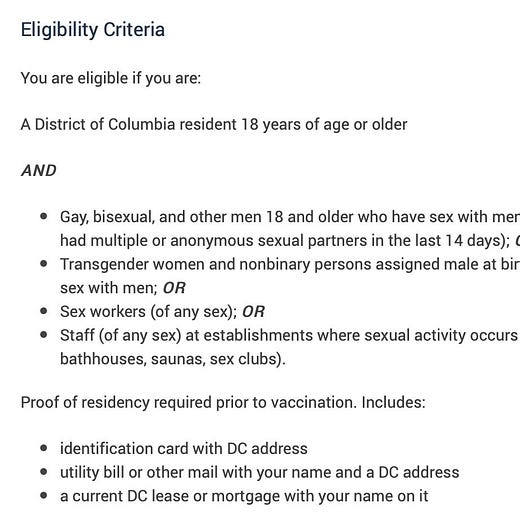 What “thoughtful prioritization” means is that, when it comes time to allocate scarce monkeypox vaccine, the same public health officials who hem and haw and obfuscate about “anyone can get monkeypox” suddenly become really clear that they’re looking for men with multiple or anonymous male sex partners. For example, compare the DC Department of Health’s monkeypox “one-sheet” with the webpage where DC Health says who can get a monkeypox vaccine — it’s night and day.