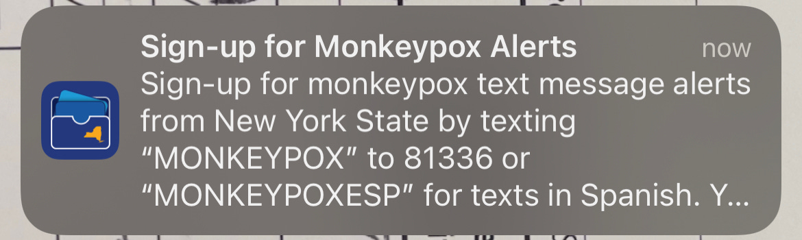 For example, I got a push notification this morning from the Excelsior Pass app — that’s the app New York State created so New Yorkers can present digital proof of COVID vaccination. The notification invited me to “sign up for monkeypox text alerts,” and it also provided a link to a New York State Department of Health page with monkeypox information.
