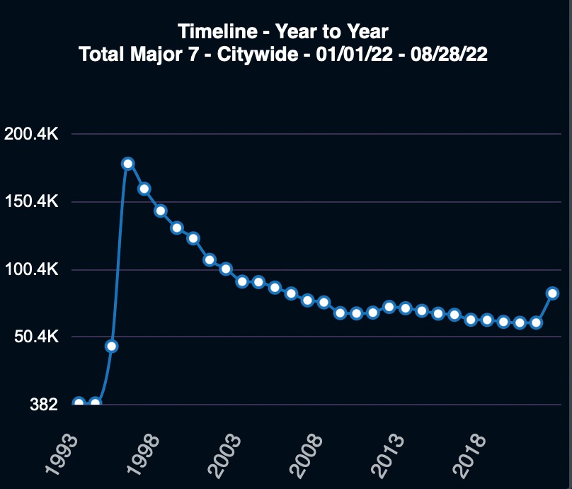 The total of just over 82,000 major crimes through August 28 constitutes a 34% increase compared to the same period in 2019.