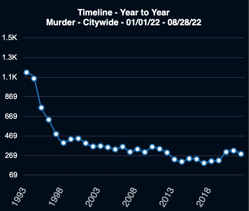There have been 282 murders so far this year, which is 38% higher than the average from 2017-19, but also a modest improvement from 2021 and 2020.