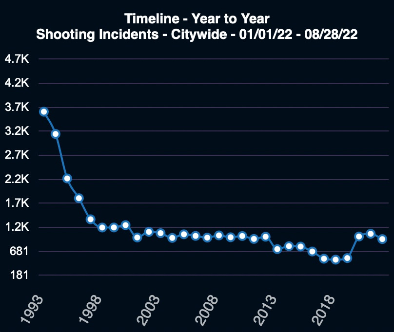 This year, through August 28, New York City has recorded 928 shooting incidents. That’s slightly improved from the same period in 2020 and 2021, but it’s about 75% higher than the rate of shootings that we experienced through late August in 2017, 2018 and 2019.