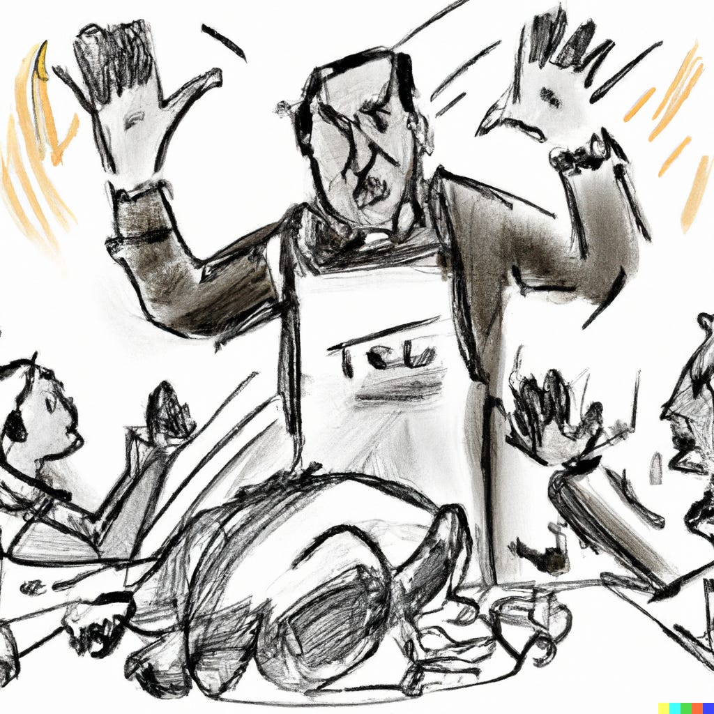 Dall-E image generation for “Overbearing Thanksgiving dinner guest in a kitchen apron, courtroom artist sketch”