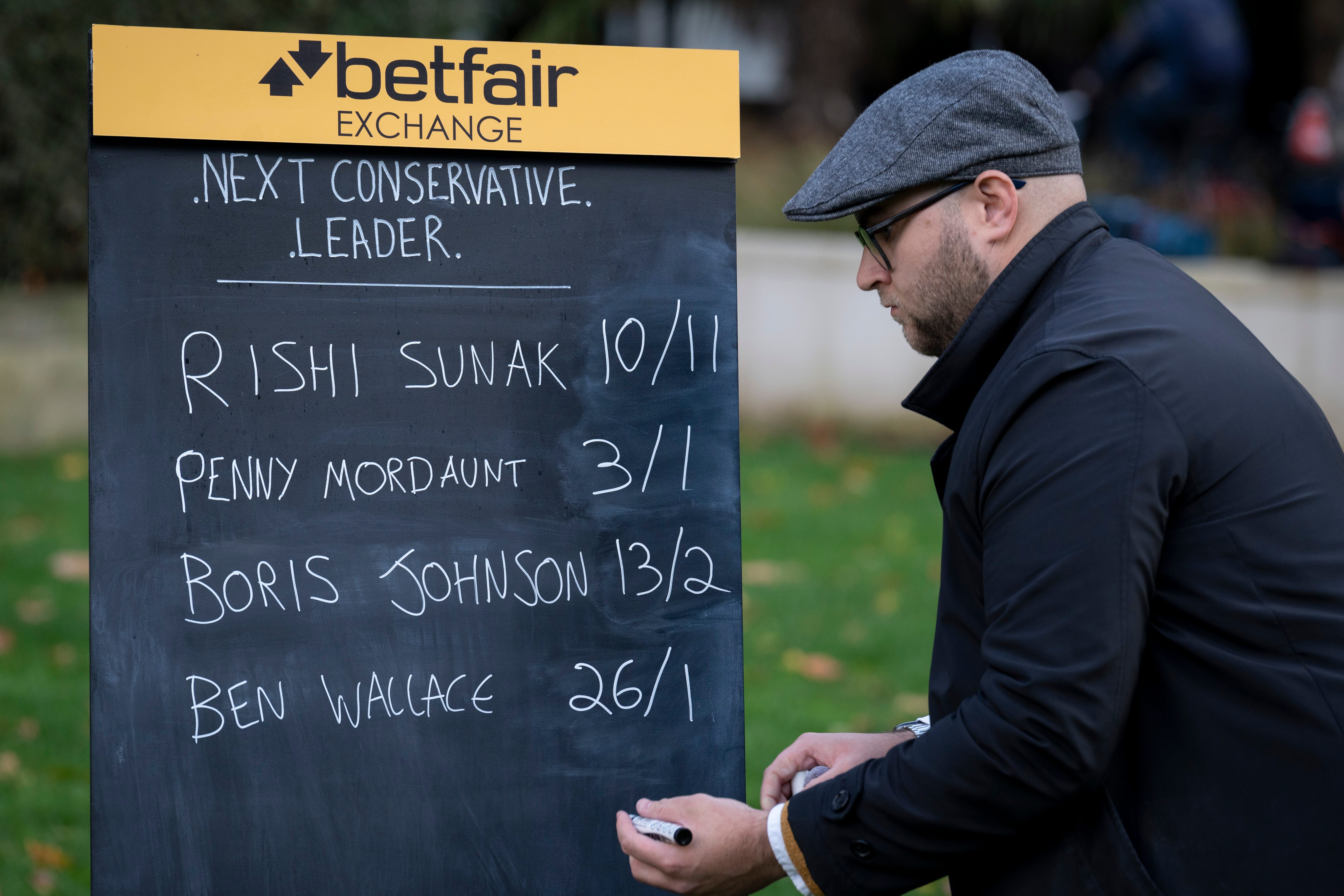 On the day that Liz Truss resigns after only 45 days, as the shortest-ever serving British Prime Minister in history, betting odds on her successor are taken in Westminster, on 20th October 2022, in London, England. (Photo by Richard Baker / In Pictures via Getty Images)